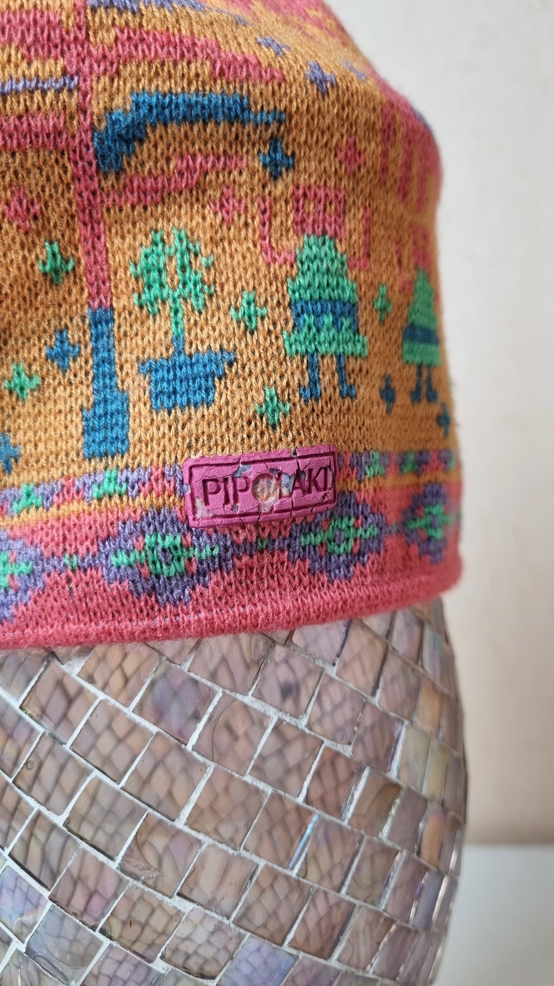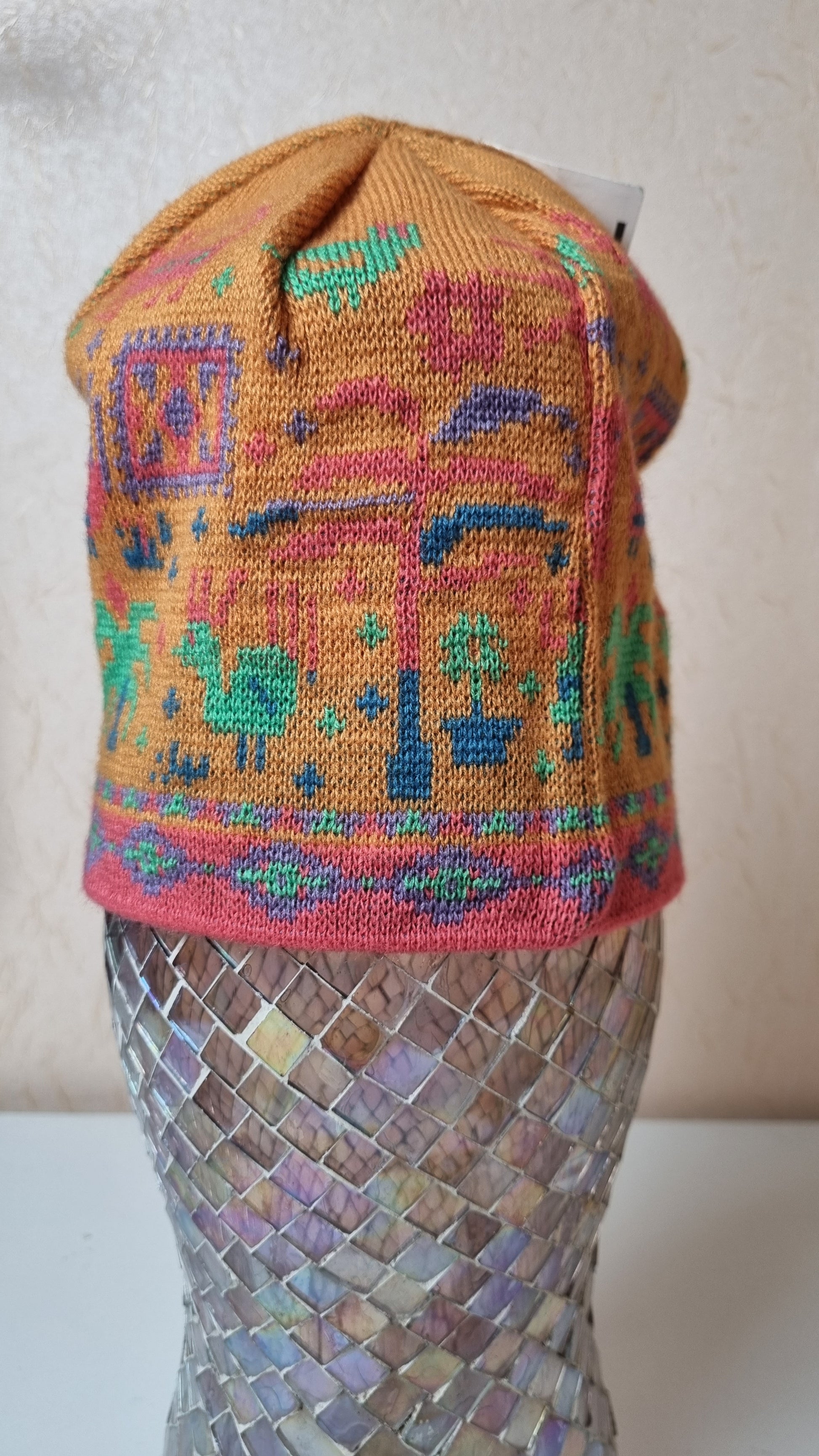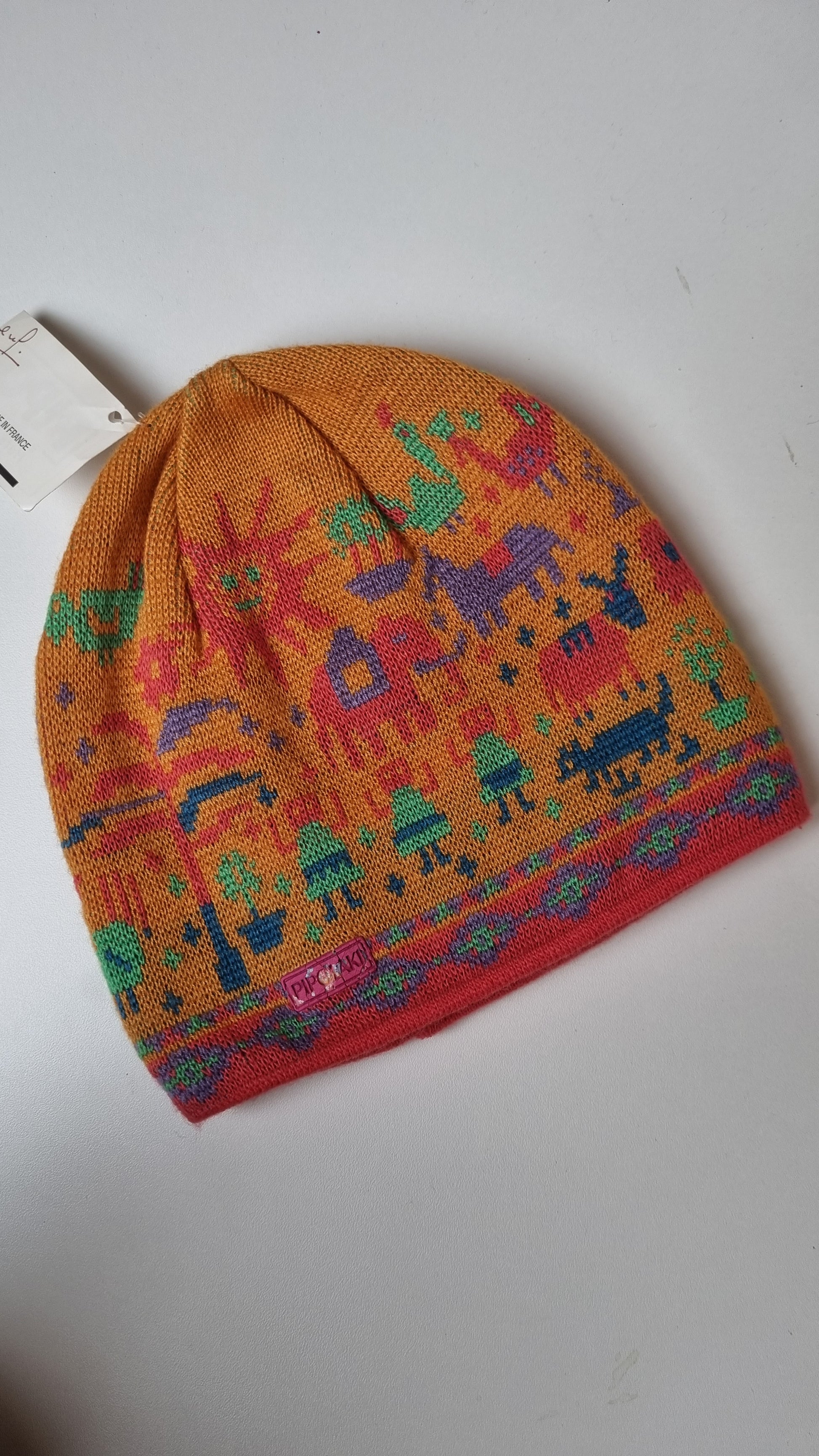 Bonnet orange imprimé soleil, éléphant petit bonhomme et palmiers. Bord intérieur doublé
