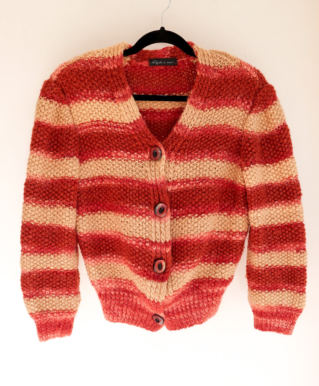 Cardigan en laine à large rayure horizontale, se boutonne, fait main