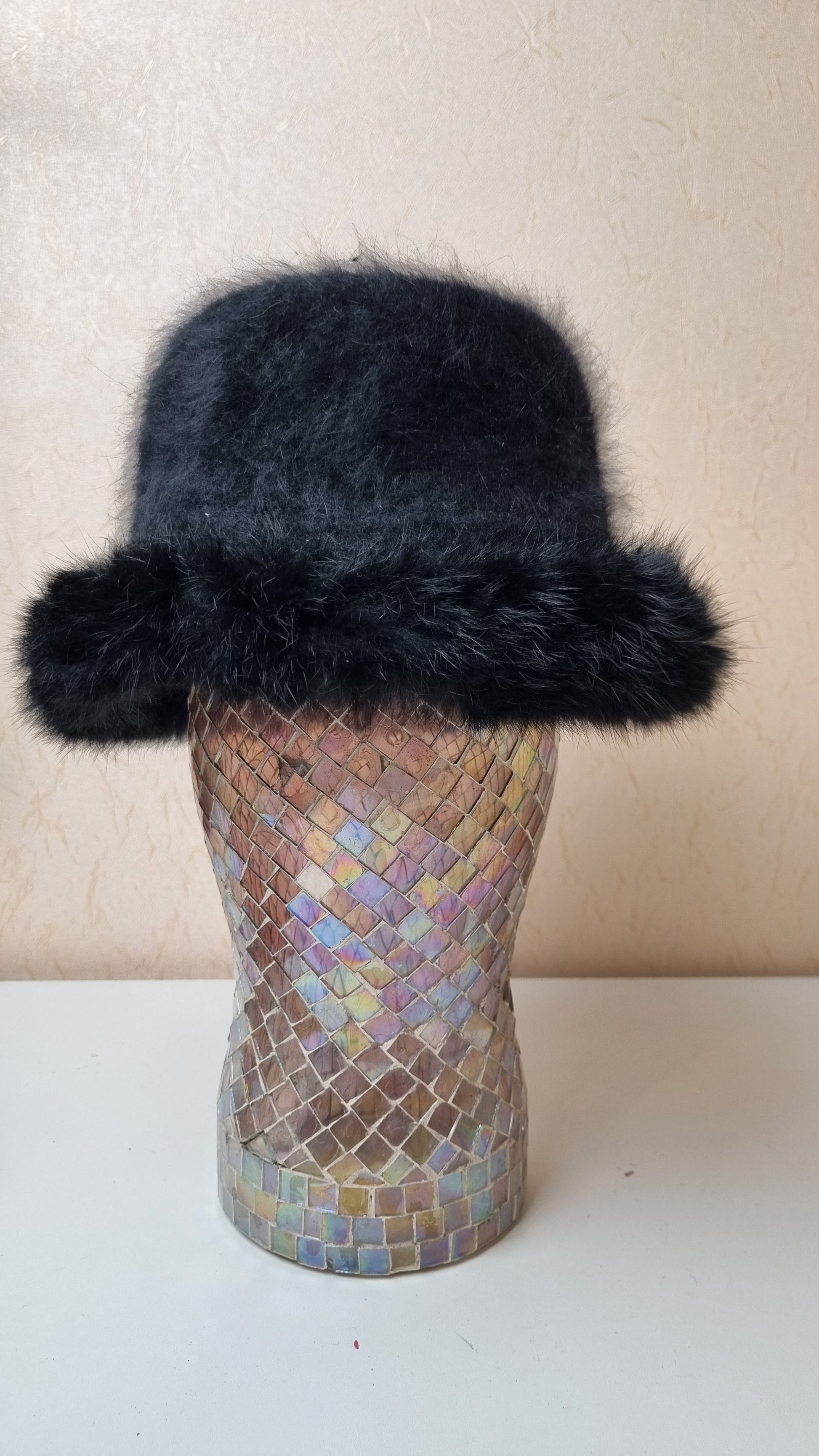 Chapeau noir en laine (angora 80%), rebord fausse Fourrure
