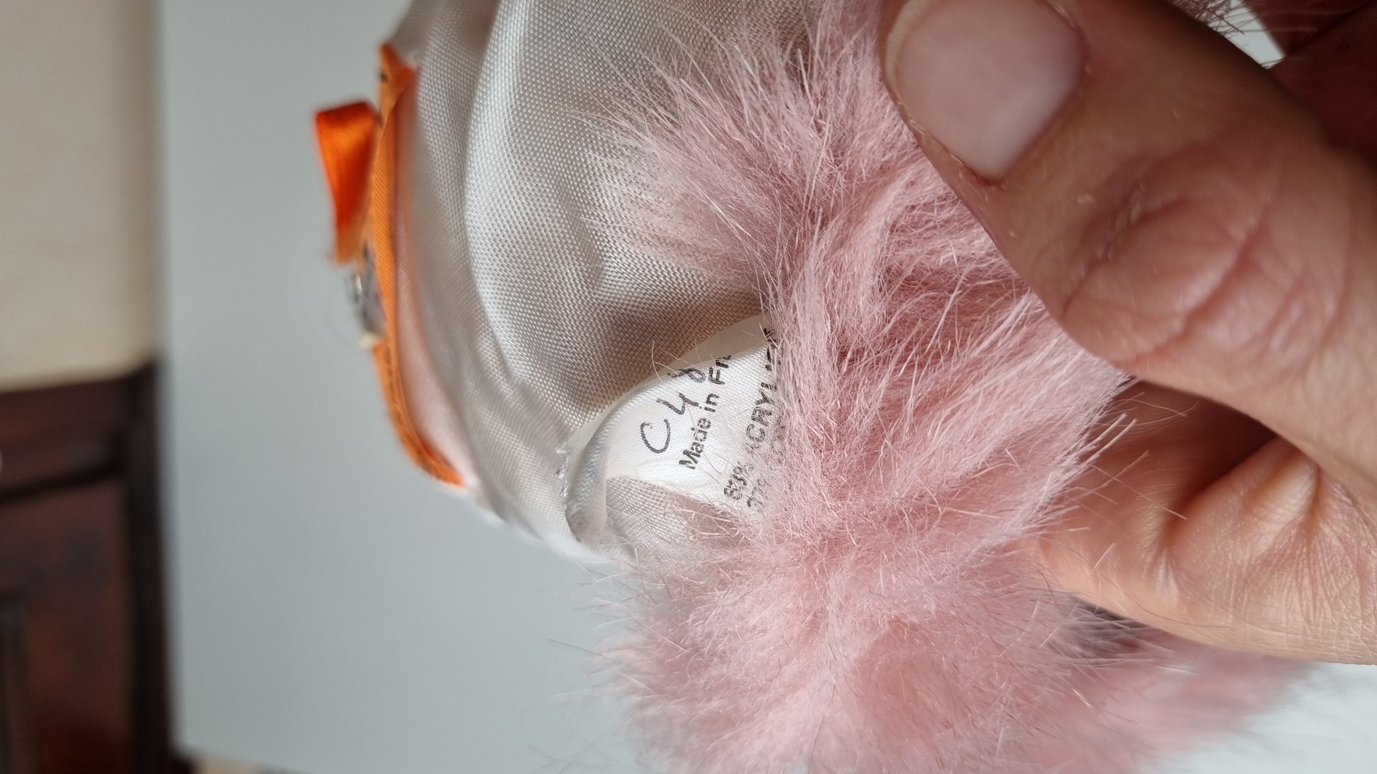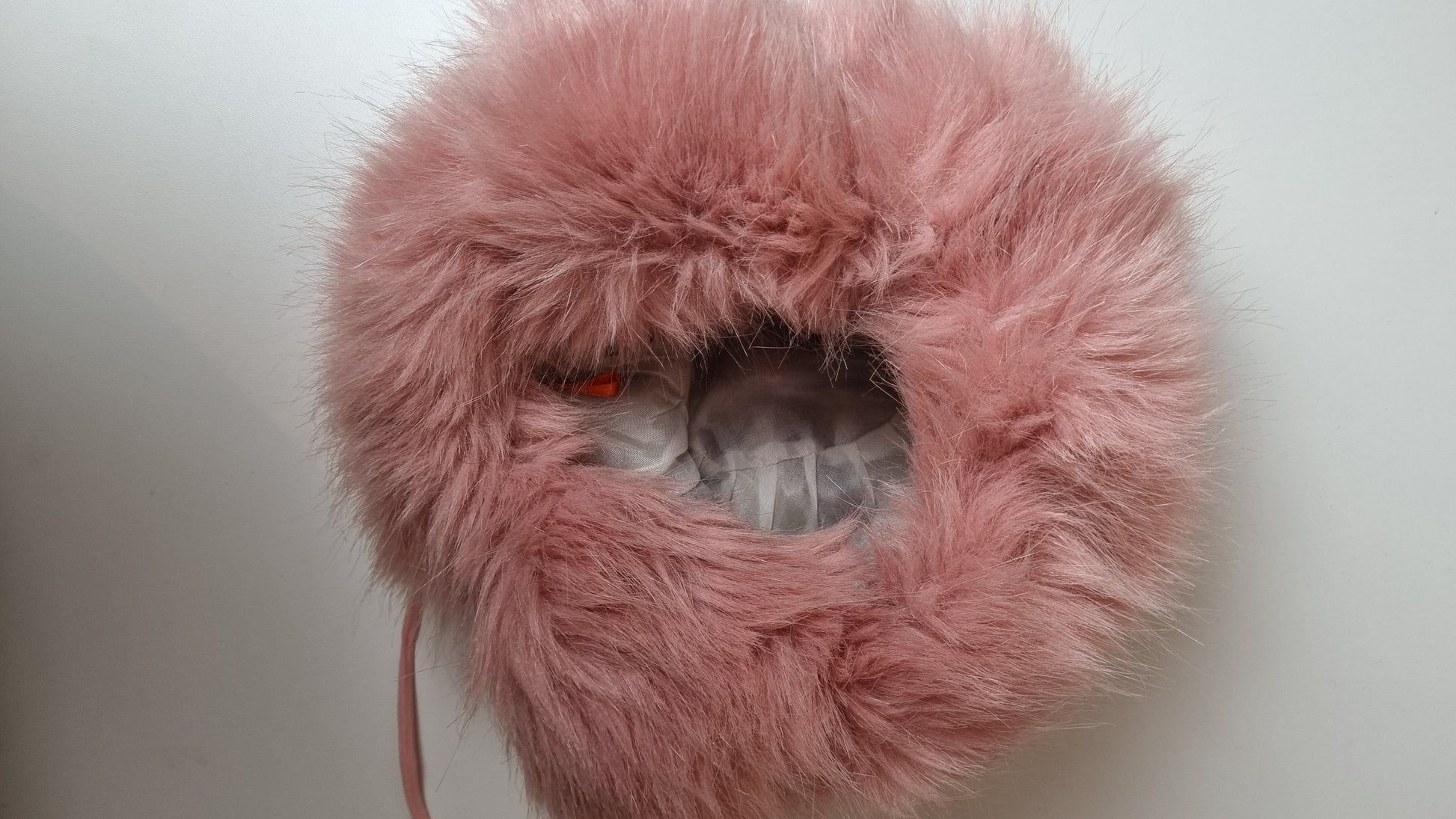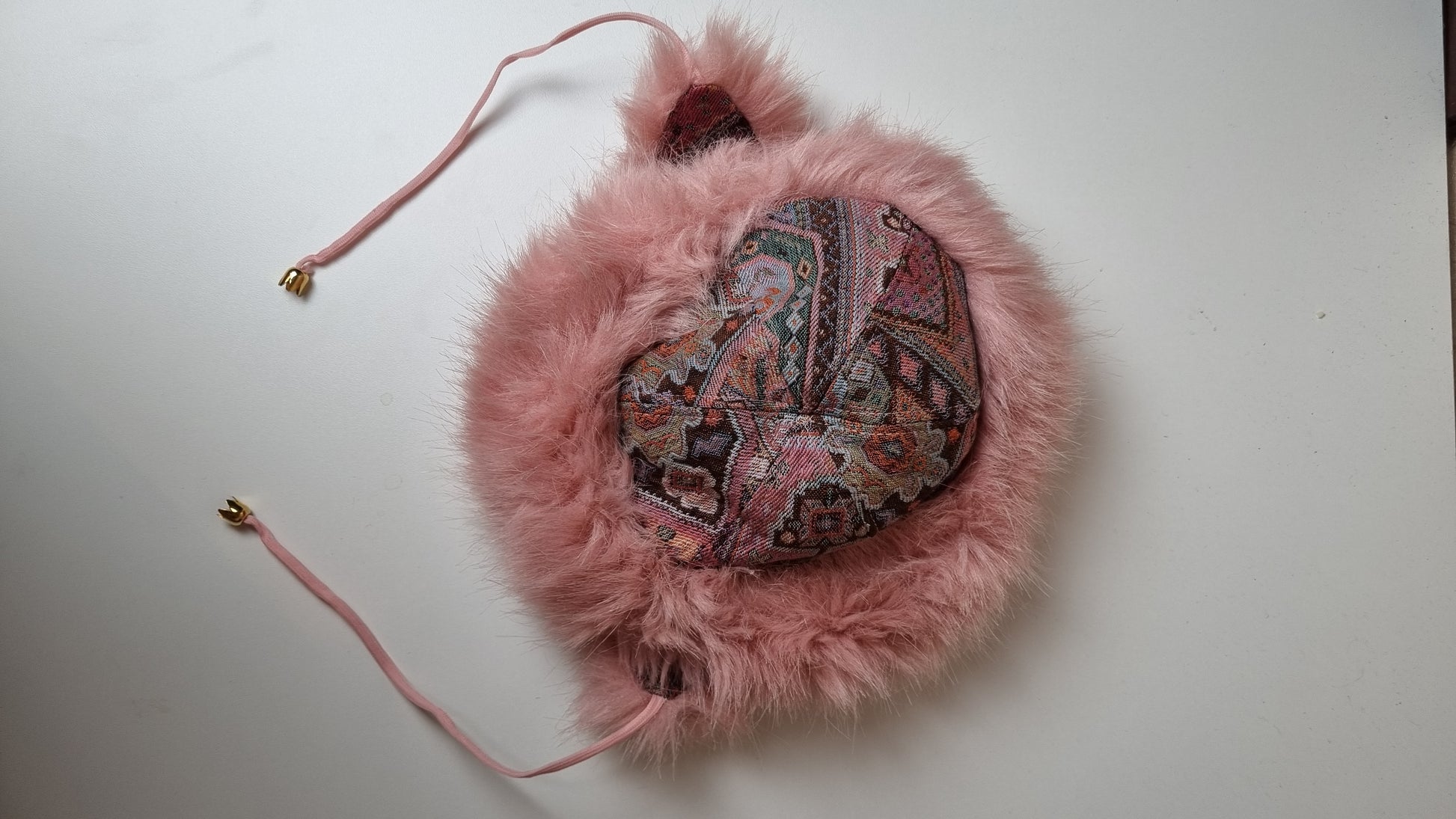 Chapka en fausse fourrure rose et tissu coton imprimee geometrique type tapisserie, cache oreille, et lien au niveau du cou