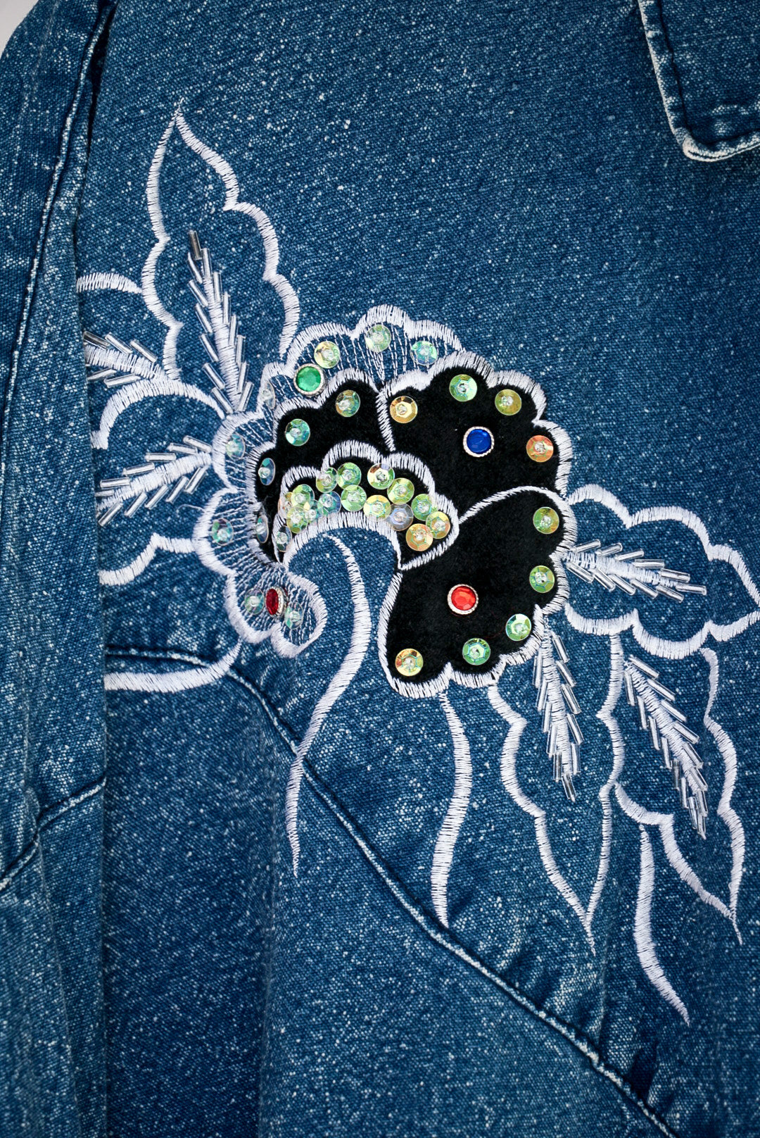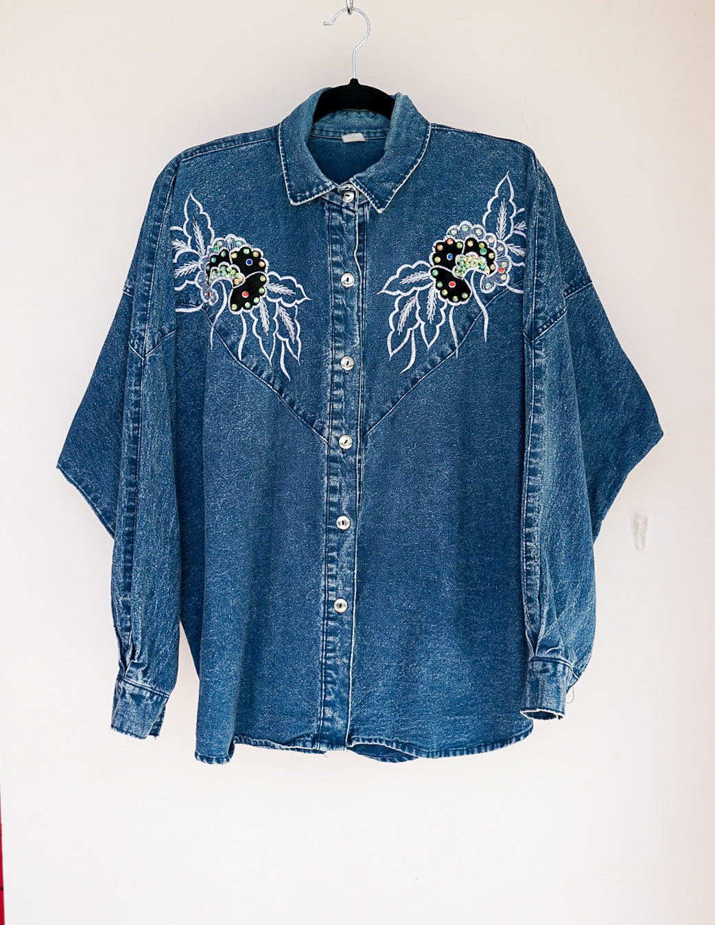 Chemise manches longues bleu en denim, coupe des années 80 avec ces typiques manches chauve souris