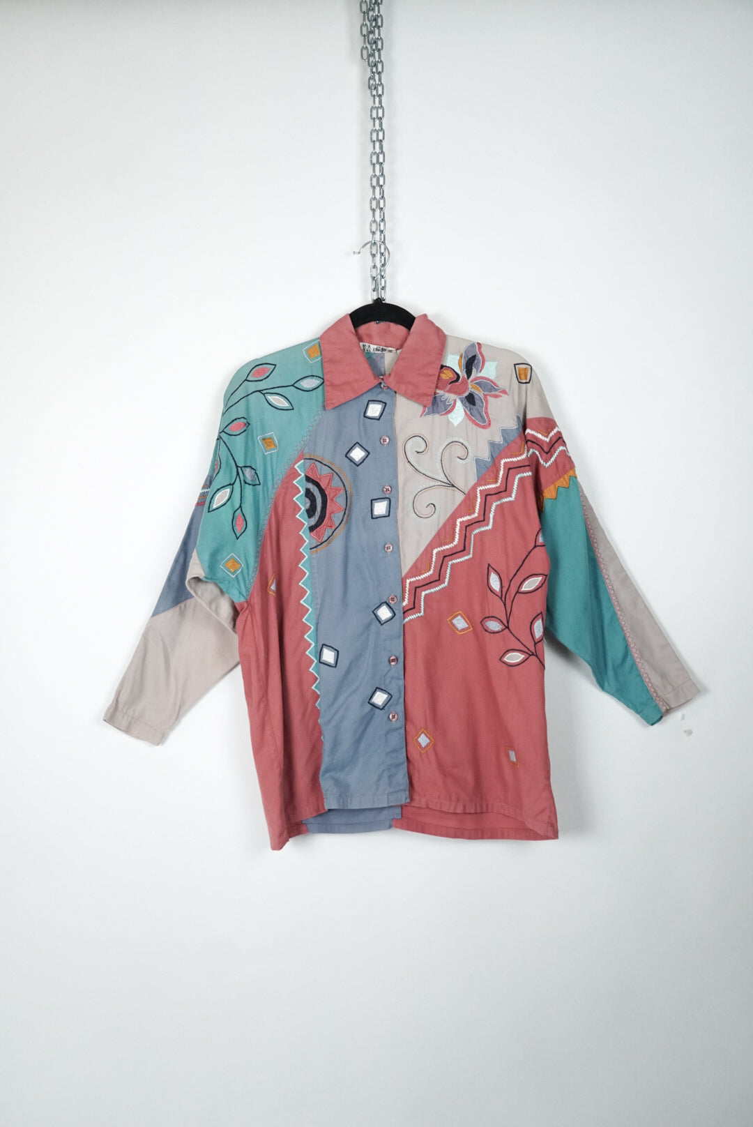 Chemise multicouleur brodé de fleurs, losanges, demi soleil, motif géométrique
