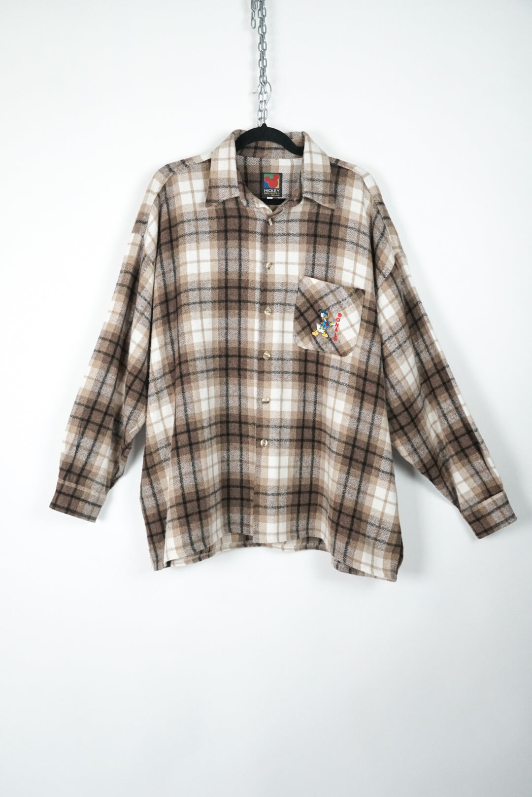 Chemise en flanelle Mickey dans les tons beige, épaisse, oversize, patch Mickey sur la poche poitrine