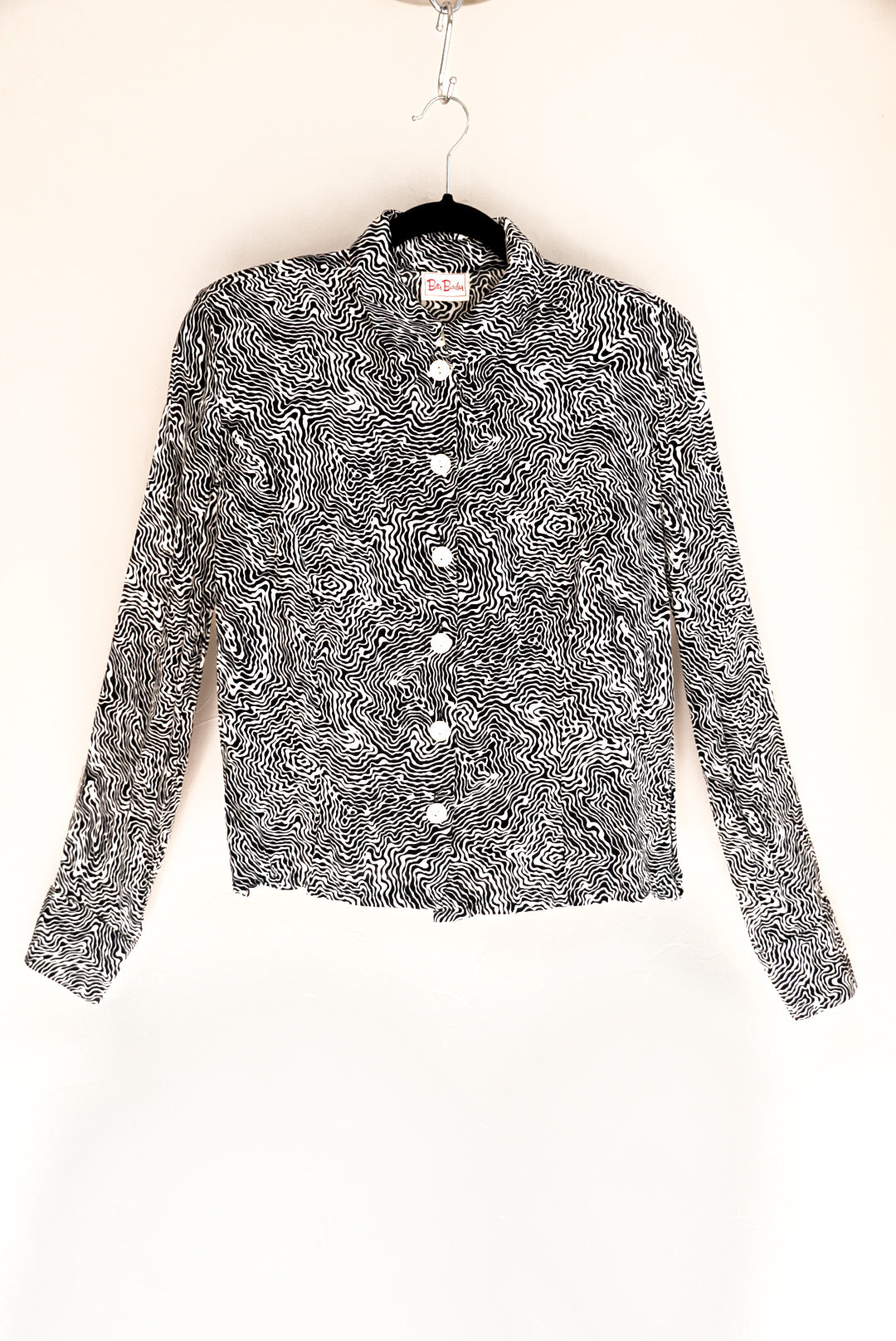 Chemise motif psychédélique ou animal, cintré, col chemise en pointe, épaulette, marque Betty Barclay, années 90