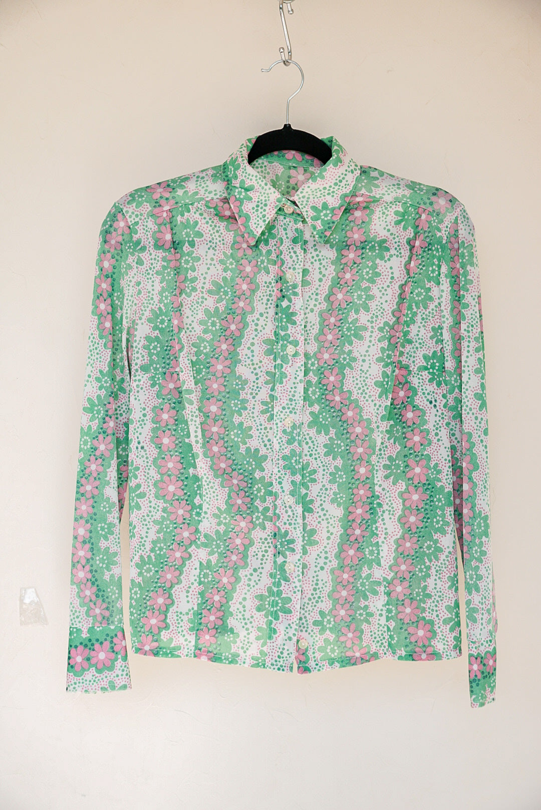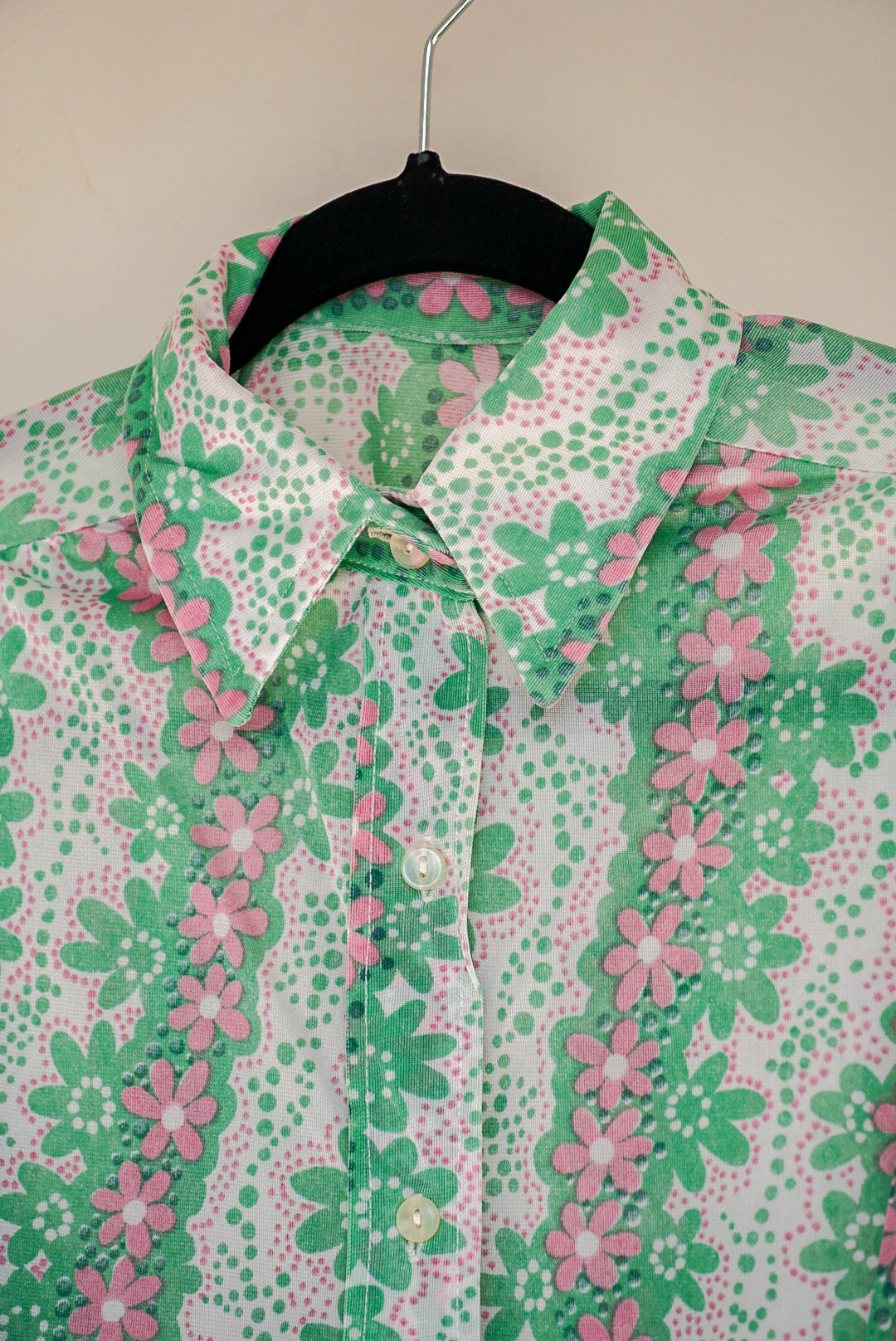 Chemise à manches longues à fleurs rose et verte, des annees 70, légère, col doublé, pince aux niveaux de la poitrine