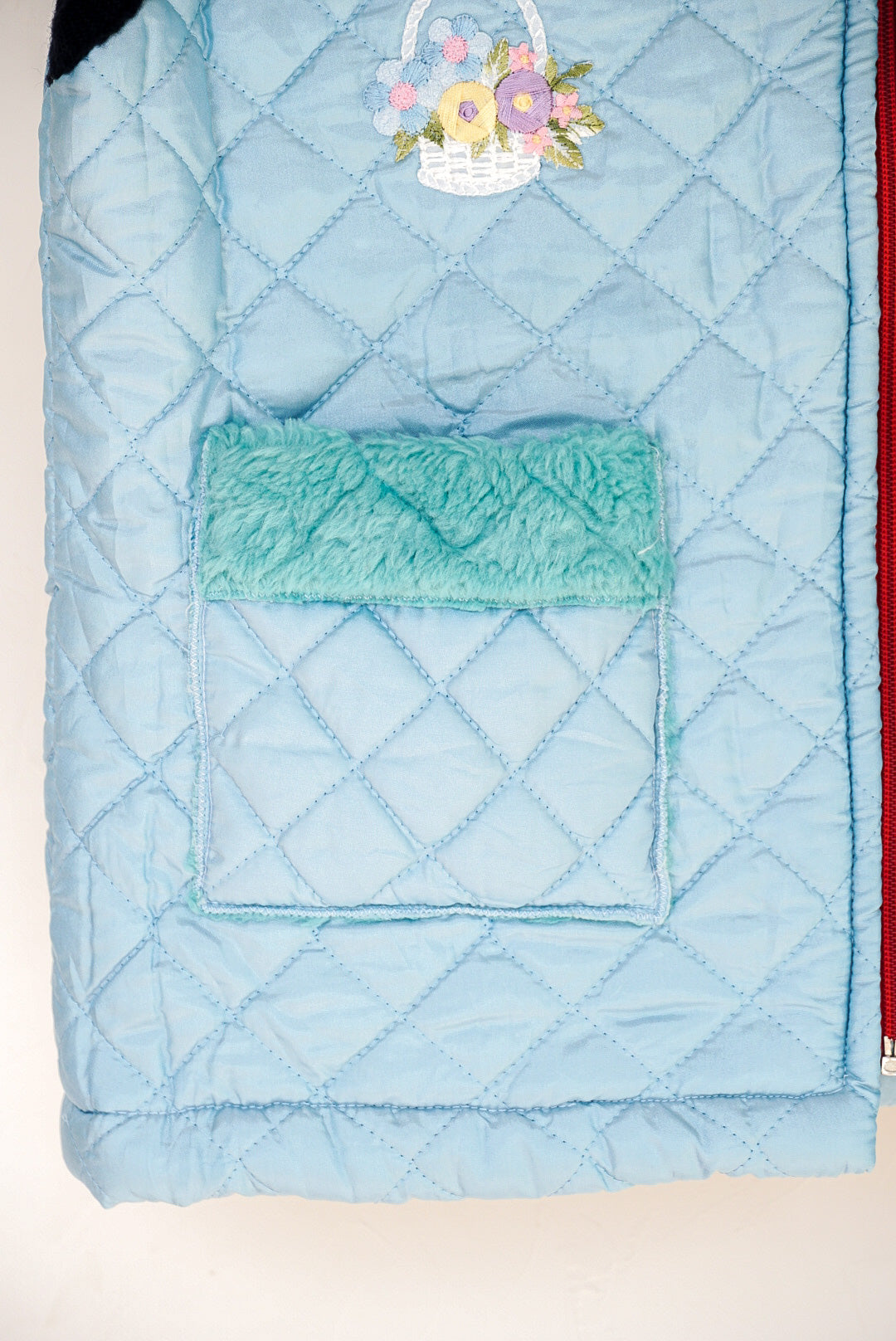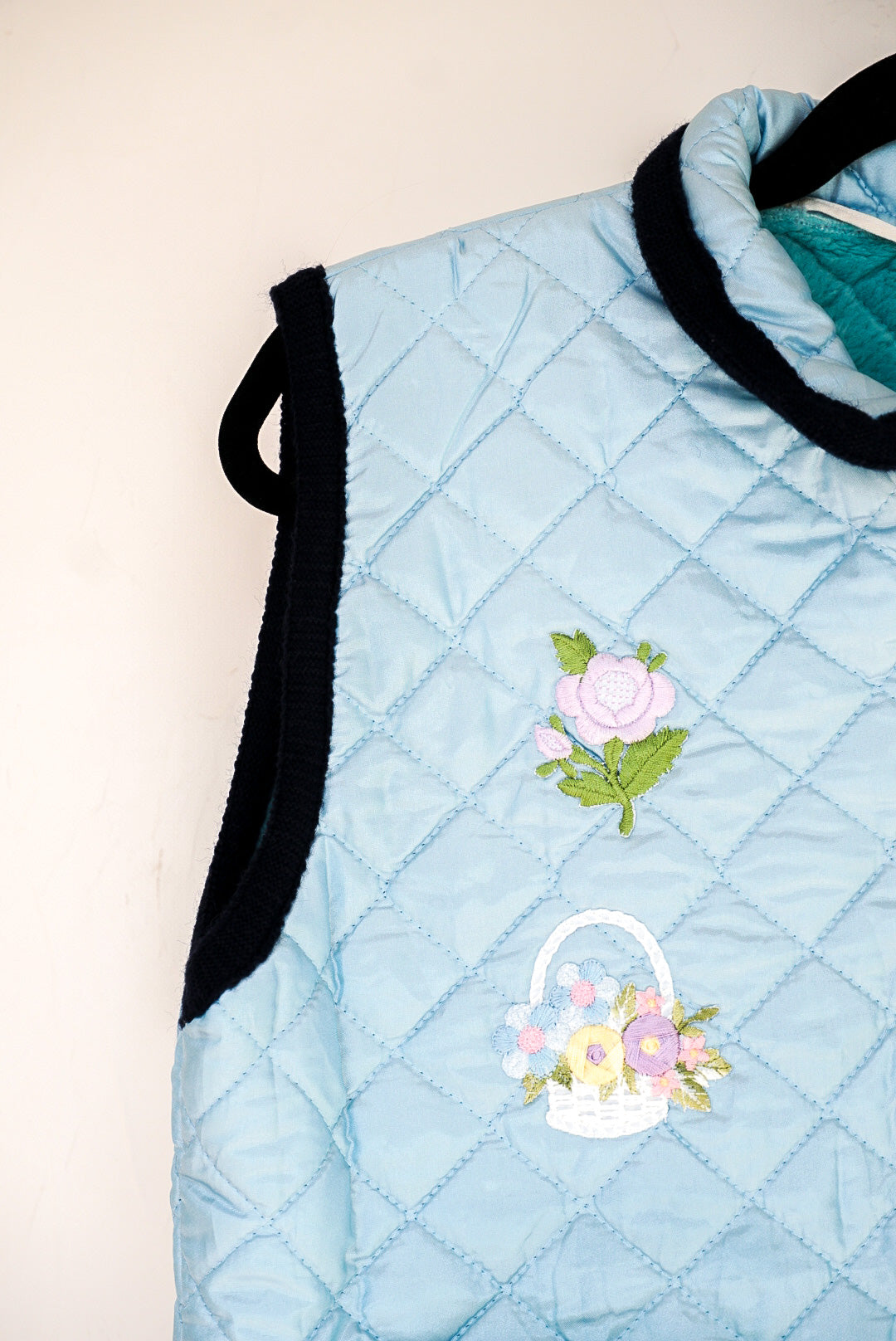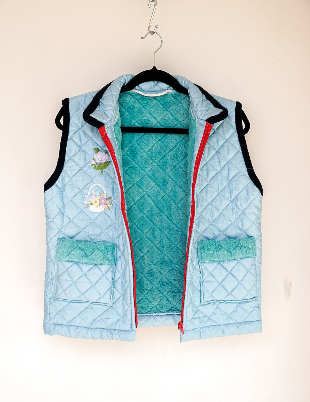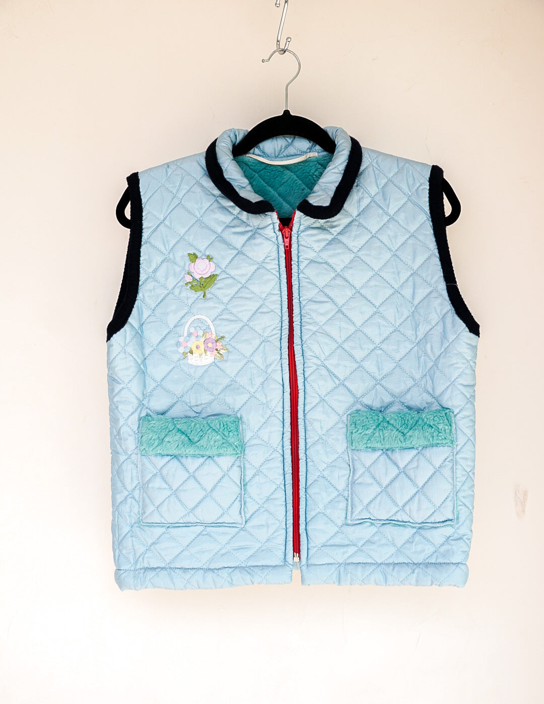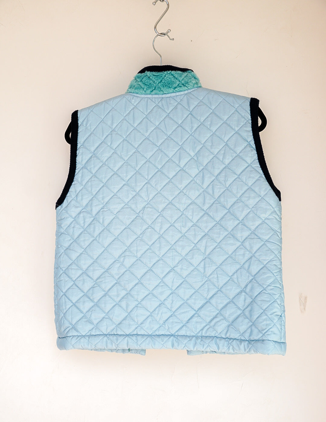 Doudoune bleu clair matelassé sans manche fourrée polaire intérieur, dessin brodée sur le devant, deux poches, fermeture éclair rouge, annees 90