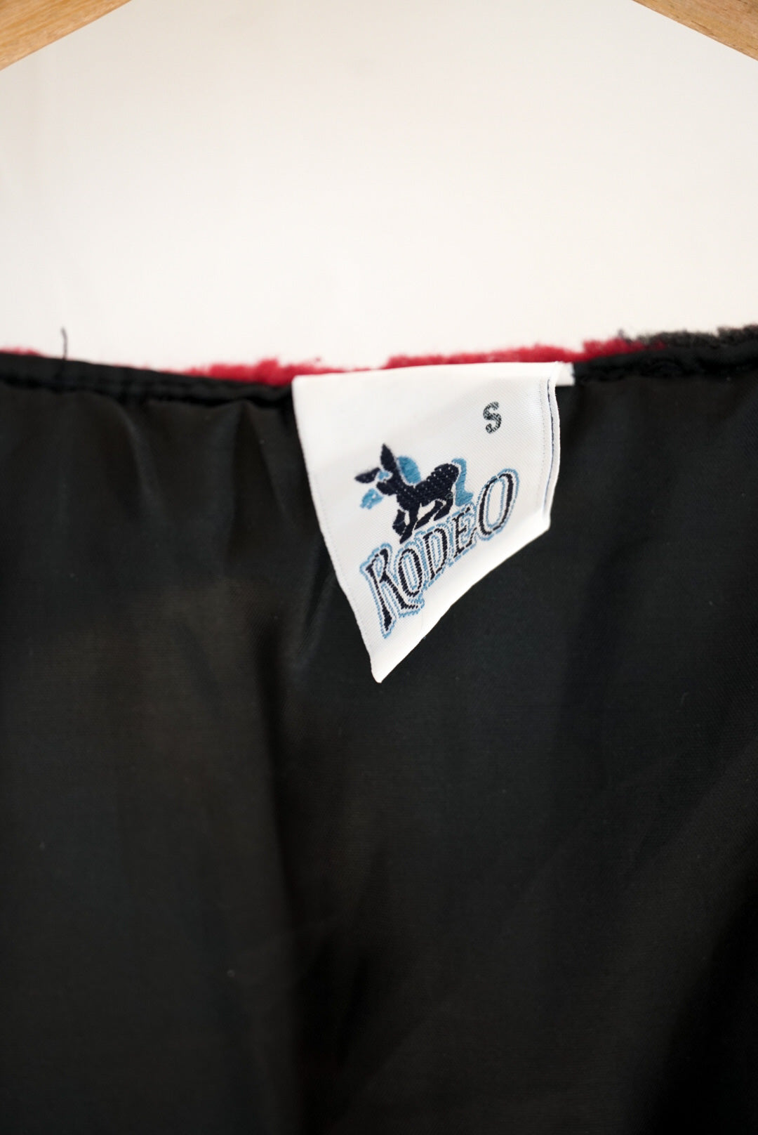 Gilet sans manches rouge en polaire, fermeture éclair, motif géométrique noir sur fond rouge, doublure synthétique, de la marque Rodéo, années 90