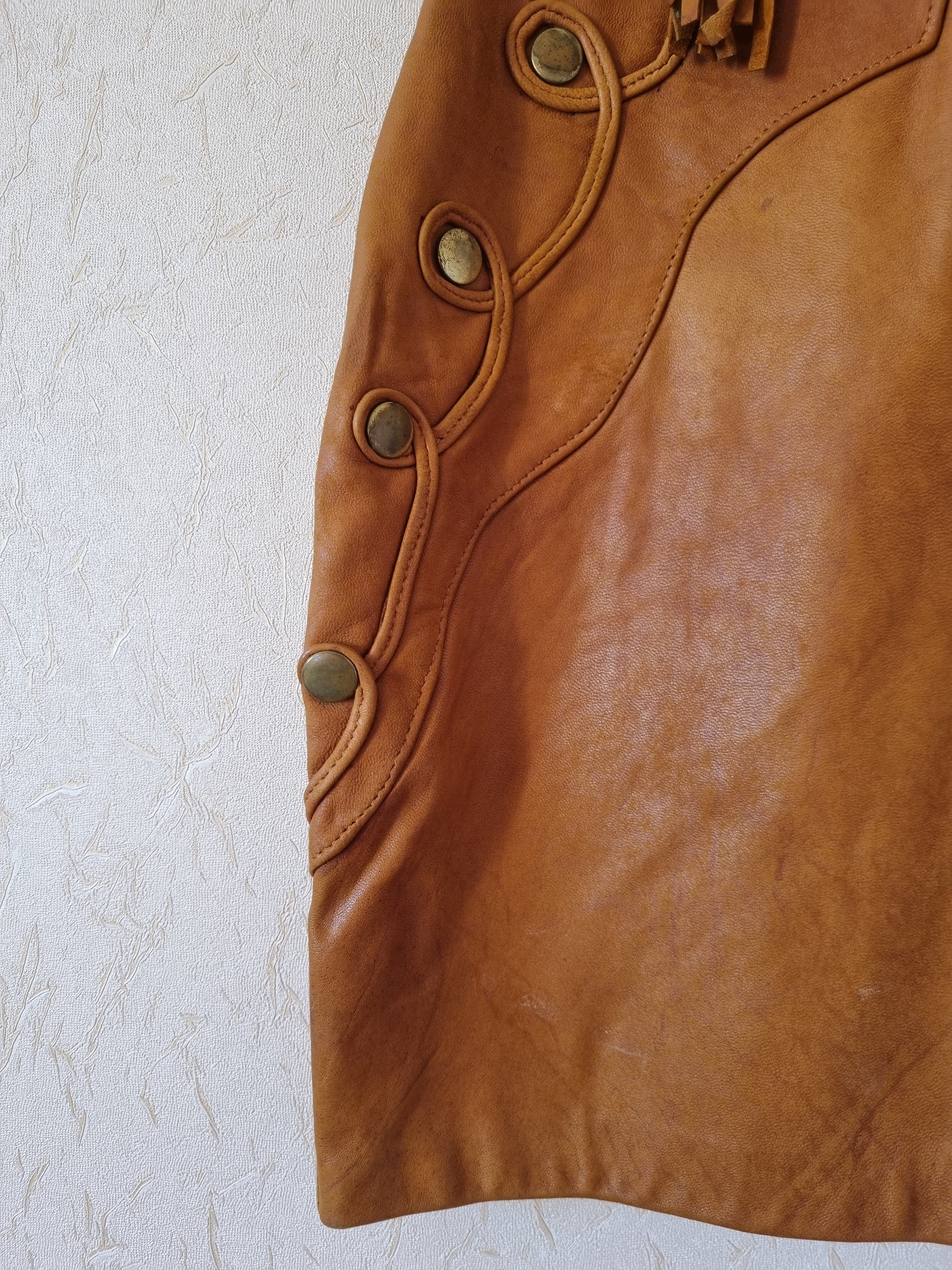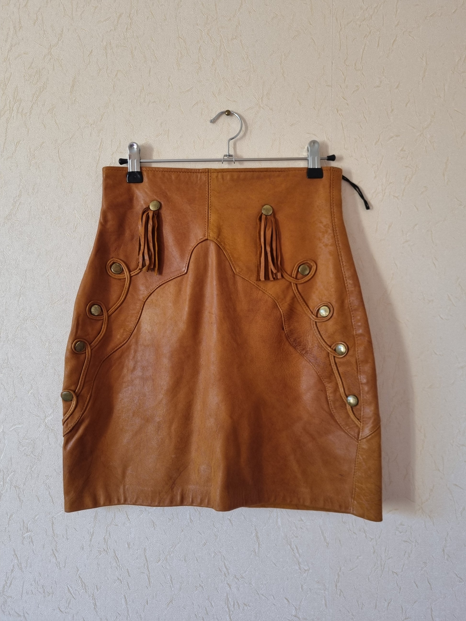 Jupe courte taille haute en cuir de la marque Gap, des années 80's, petits pompons décoratifs et rivet plat dorée, fermeture éclair milieu dos, cuir, doublure en nylon, fabriqué en Angleterre