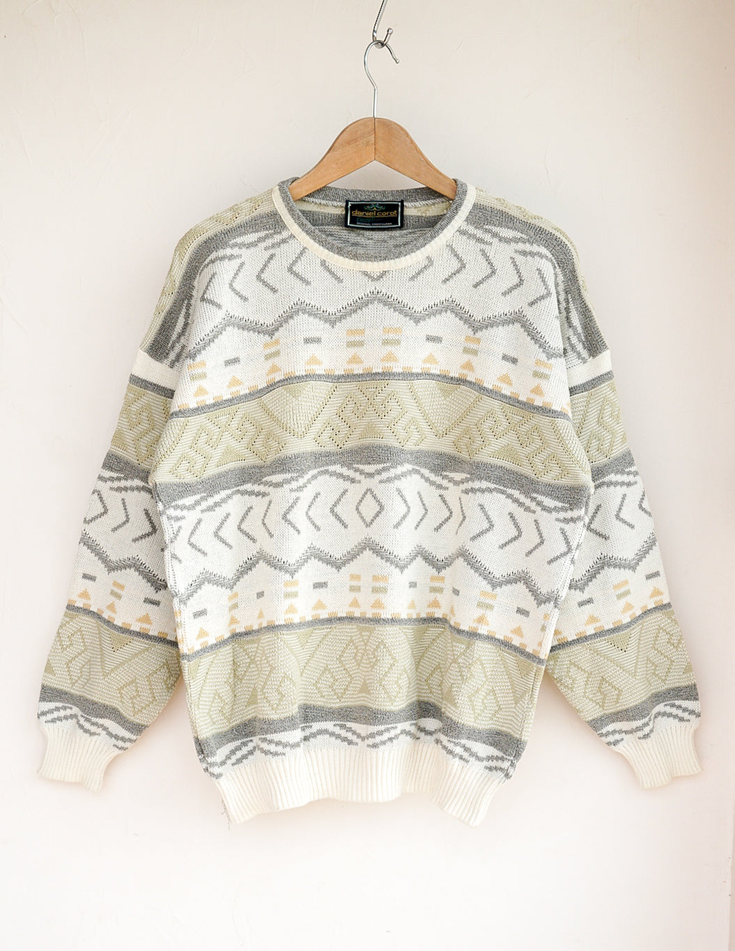 Pull blanc cassé et vert pastel à motif aztèque, bord côte en bon état, oversize, années 80,