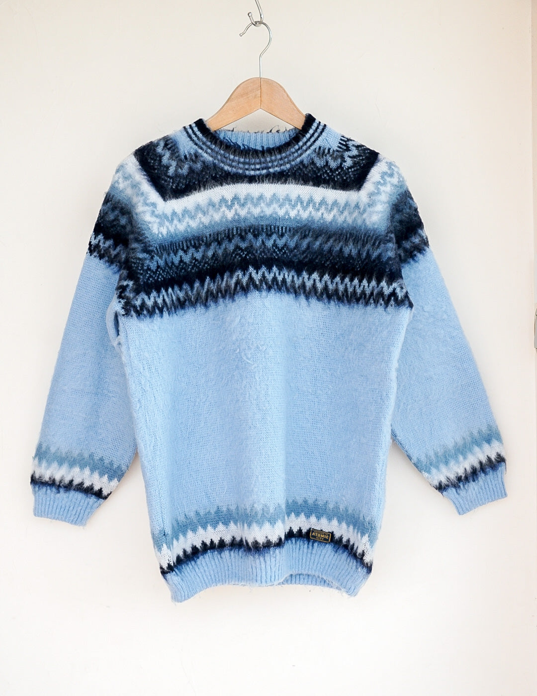 Pull bleu clair, rayure géométrique au col, tout doux, effet mohair duveteux, bord côte en très bon état, année 90