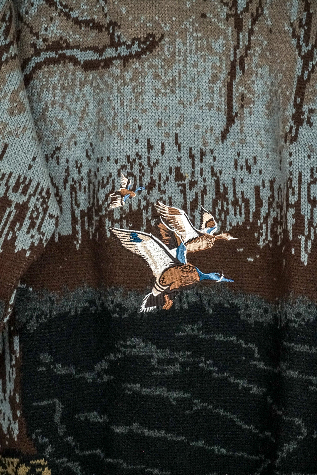 Pull épais à patch canard et motif foret, malle épaisse, bord côte en très bon état avec différent point de maille, fabriqué en France, de la marque Bertrand d'arley