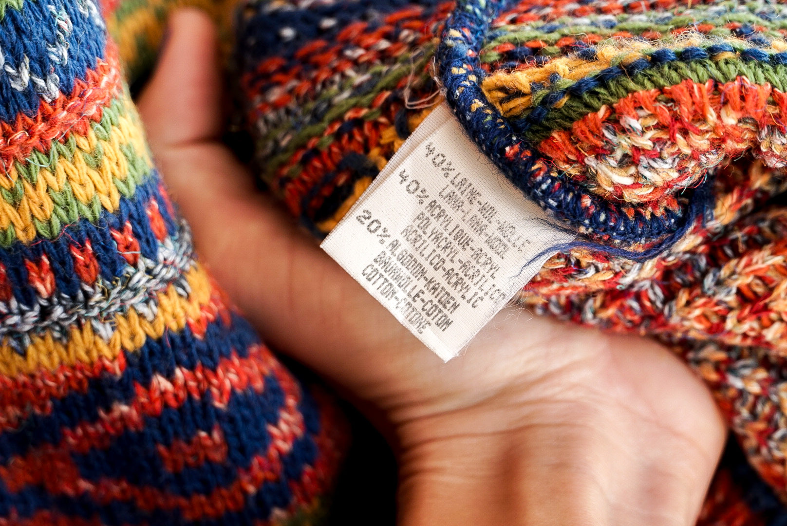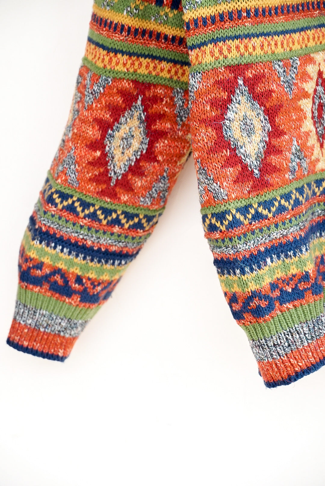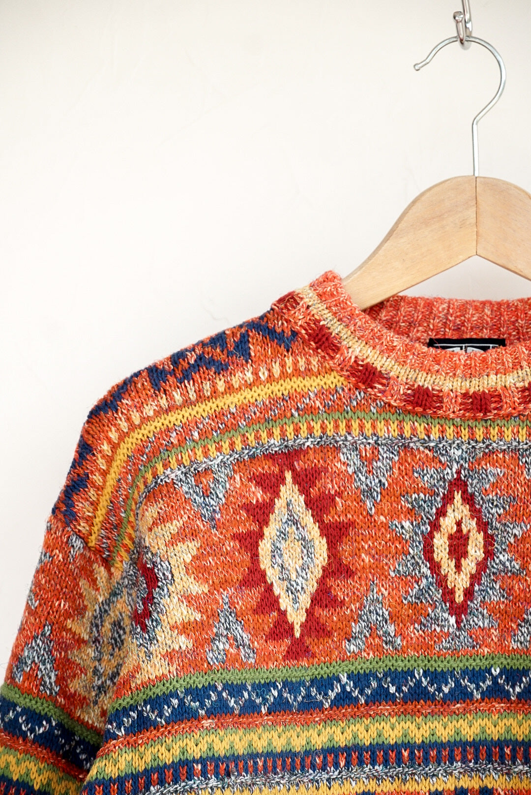 Pull coloré de ski en laine, col rond, motif rayure géométrique horizontale, bord côte en bon état, année 90