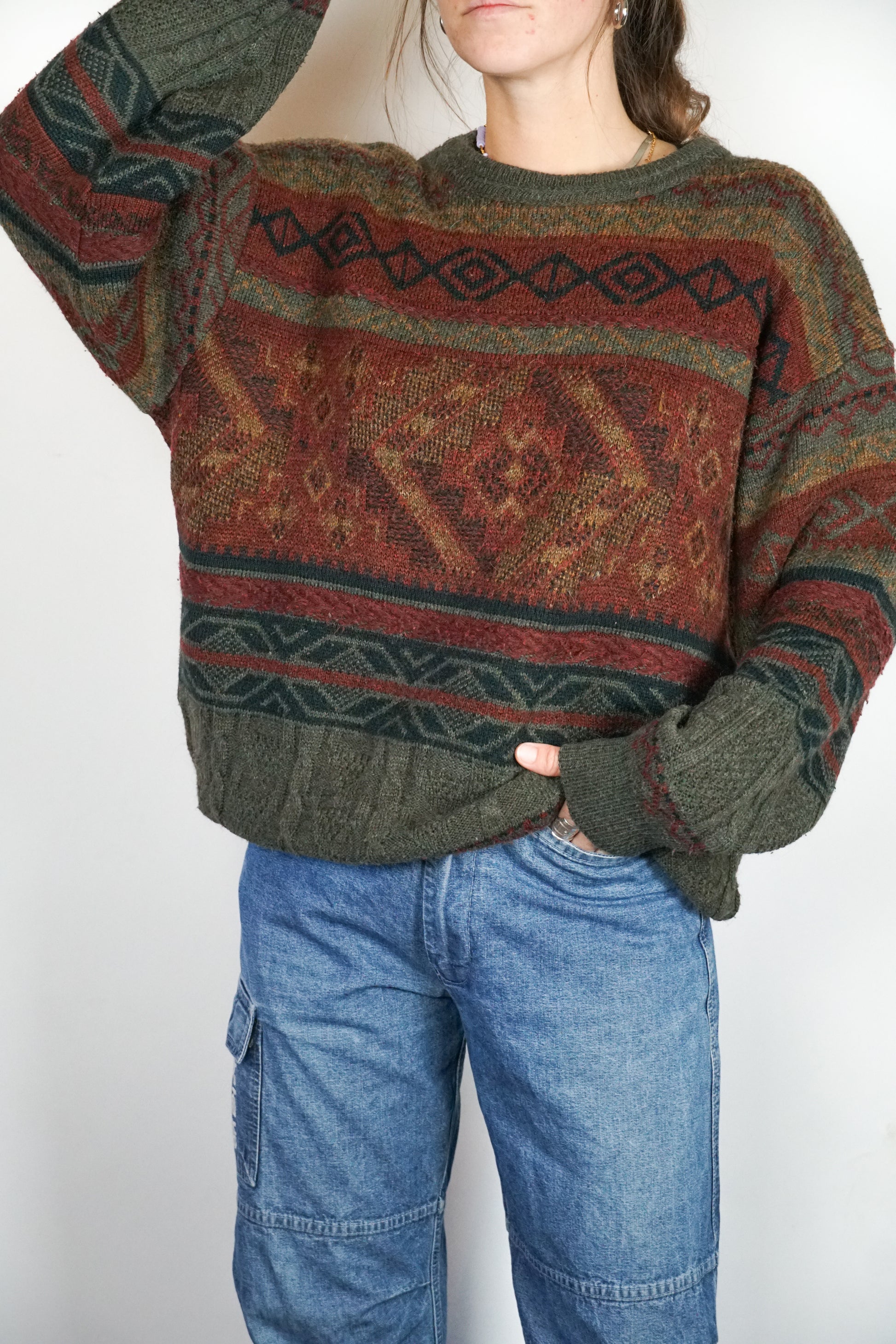 Pull à motif géométrique, des années 80, col rond, bord côte en bon état, ne gratte pas, oversize, fabriqué aux Royaume Uni