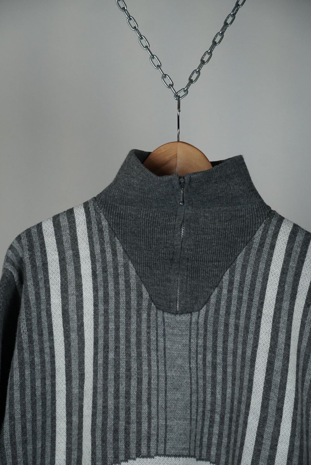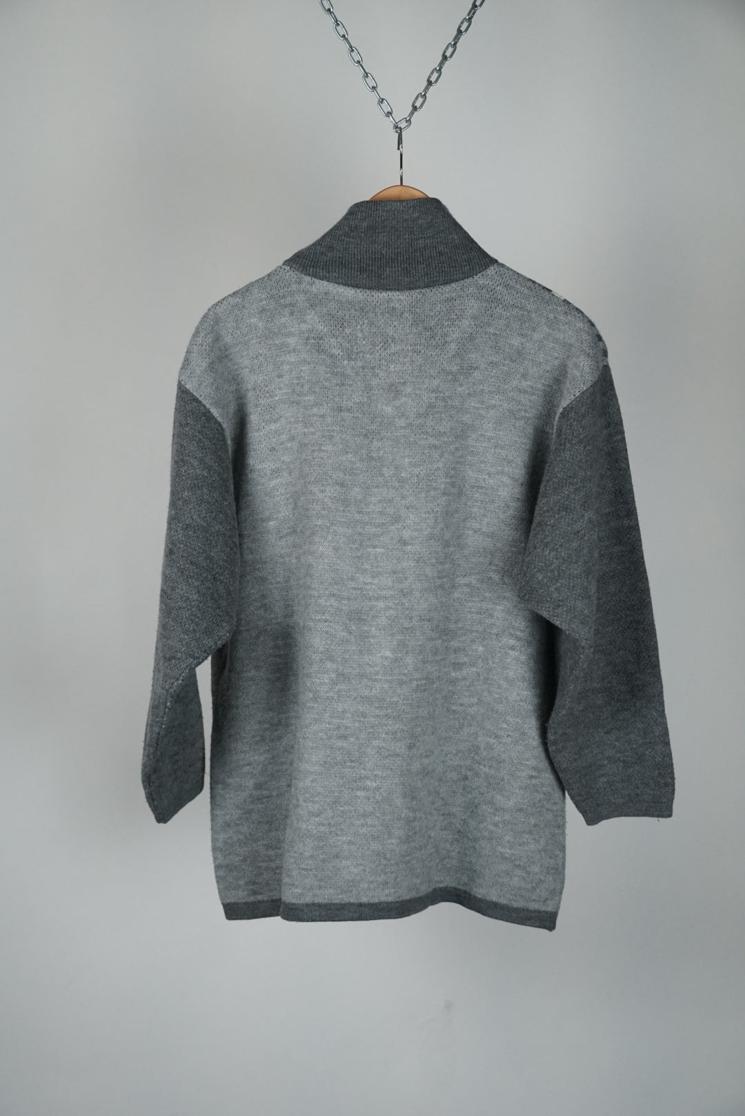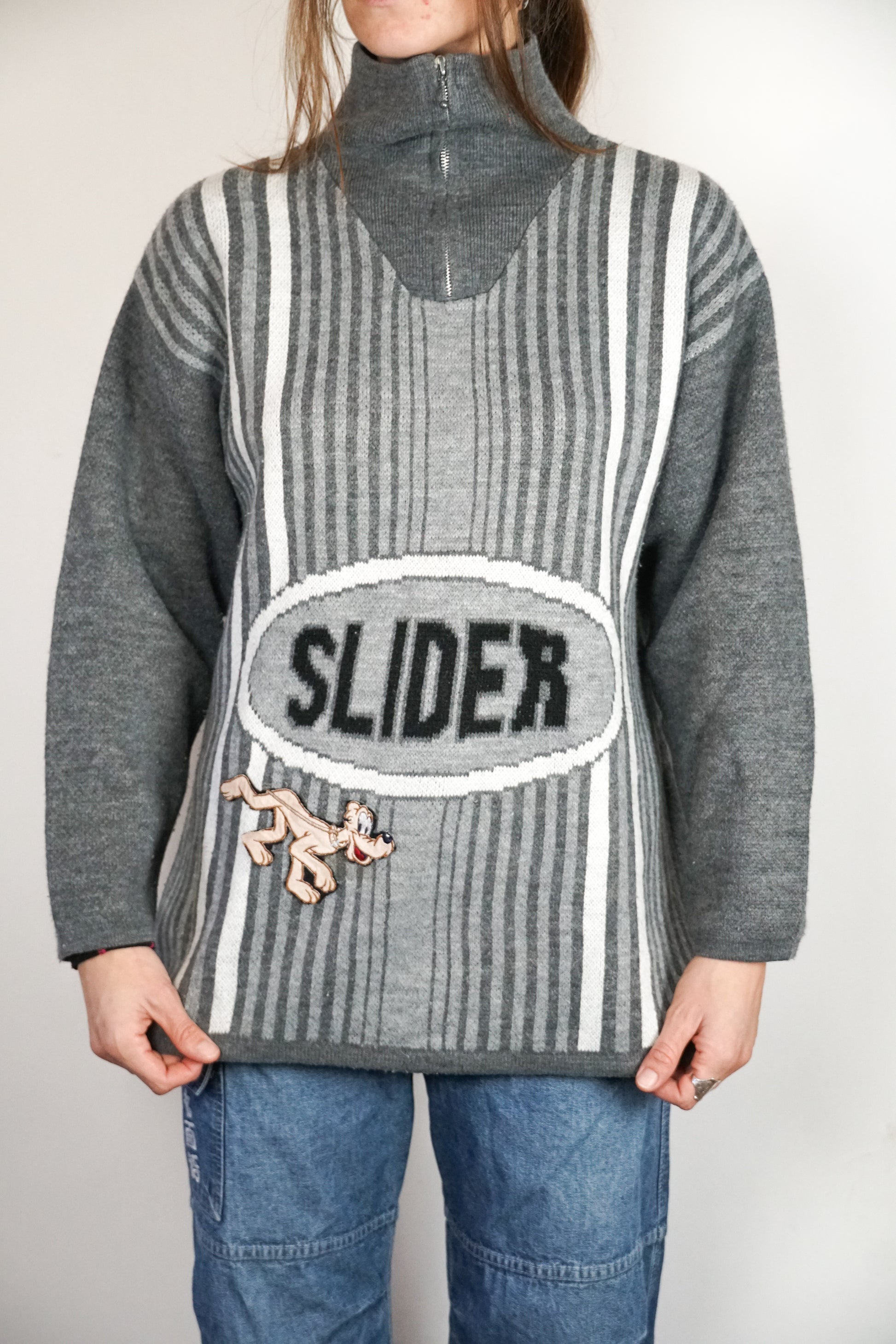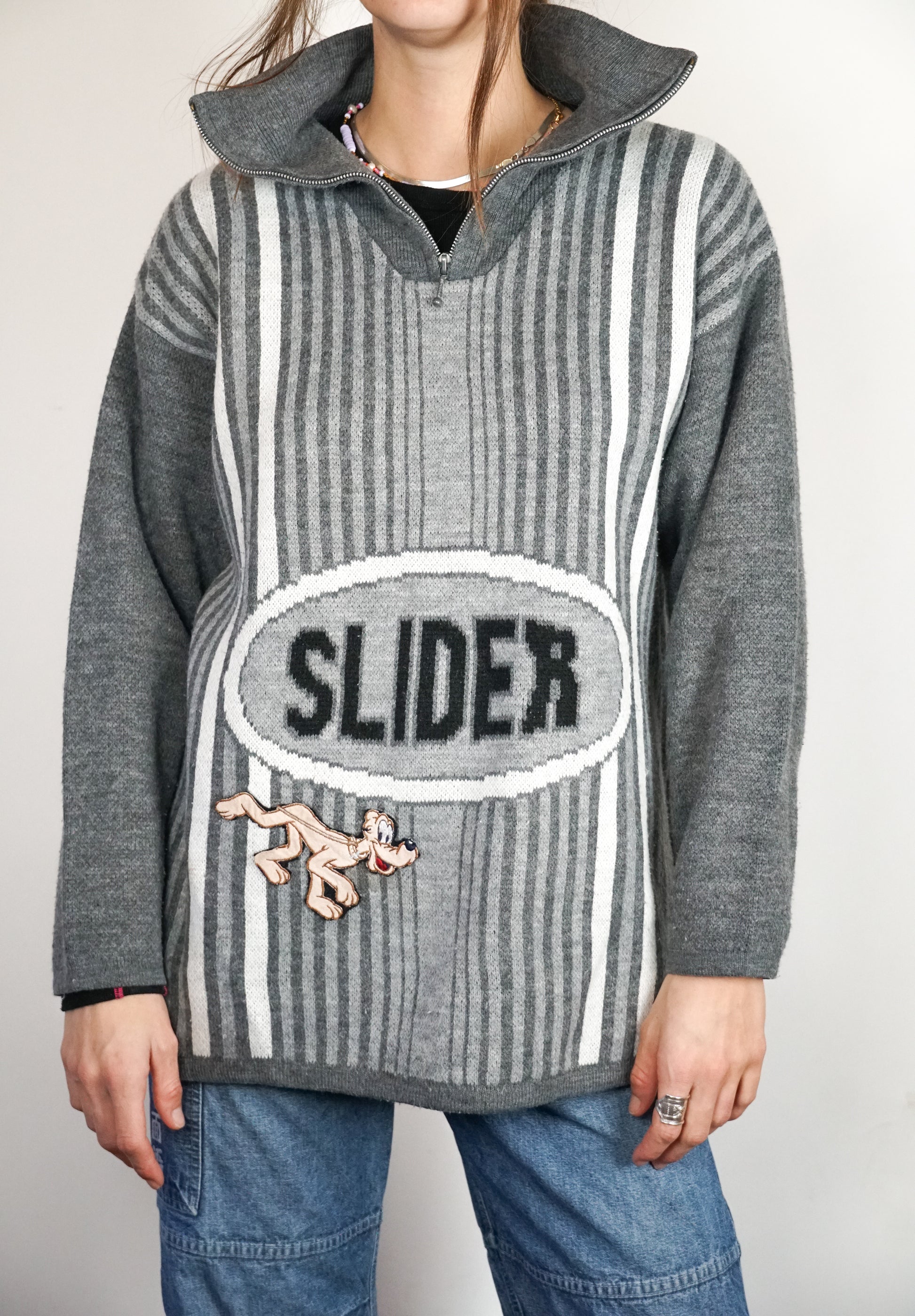 Pull gris à col camionneur, maille épaisse, coupe oversize, motif placé de Dumbo, ne gratte pas