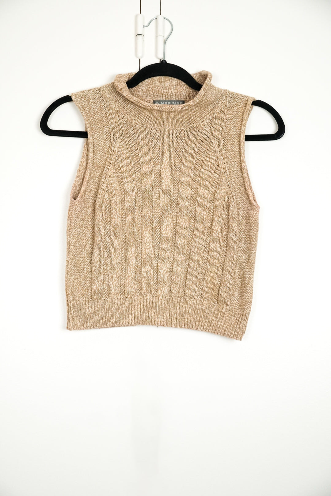 Pull sans manches beige col cheminée de la marque Naf Naf des annees 90, maille étirable, 100% coton