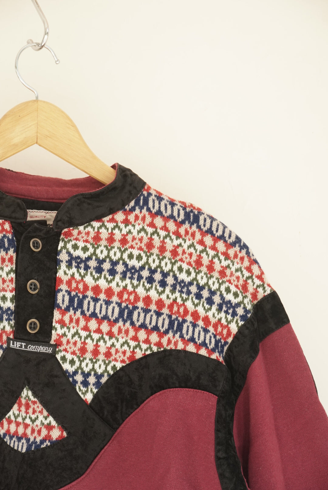 Sweat bordeaux à empiècement, encolure à motif géométrique, col en velours ras qui se boutonne à l'aide de bouton pression, années 80, de la marque Lift Company