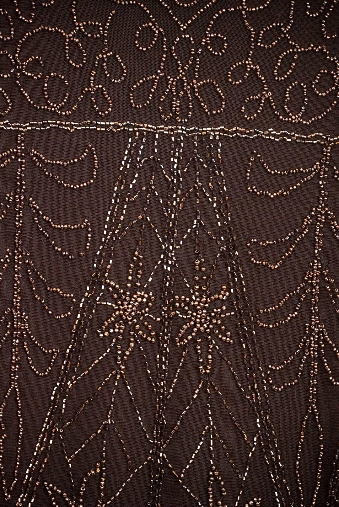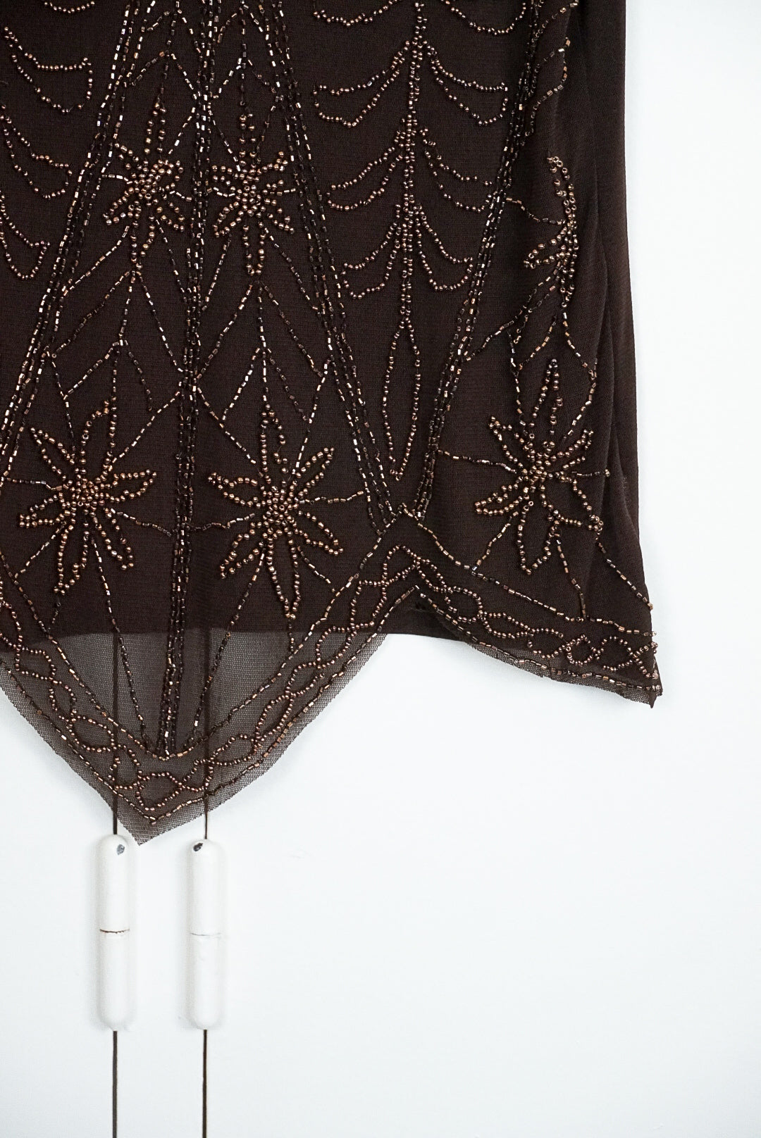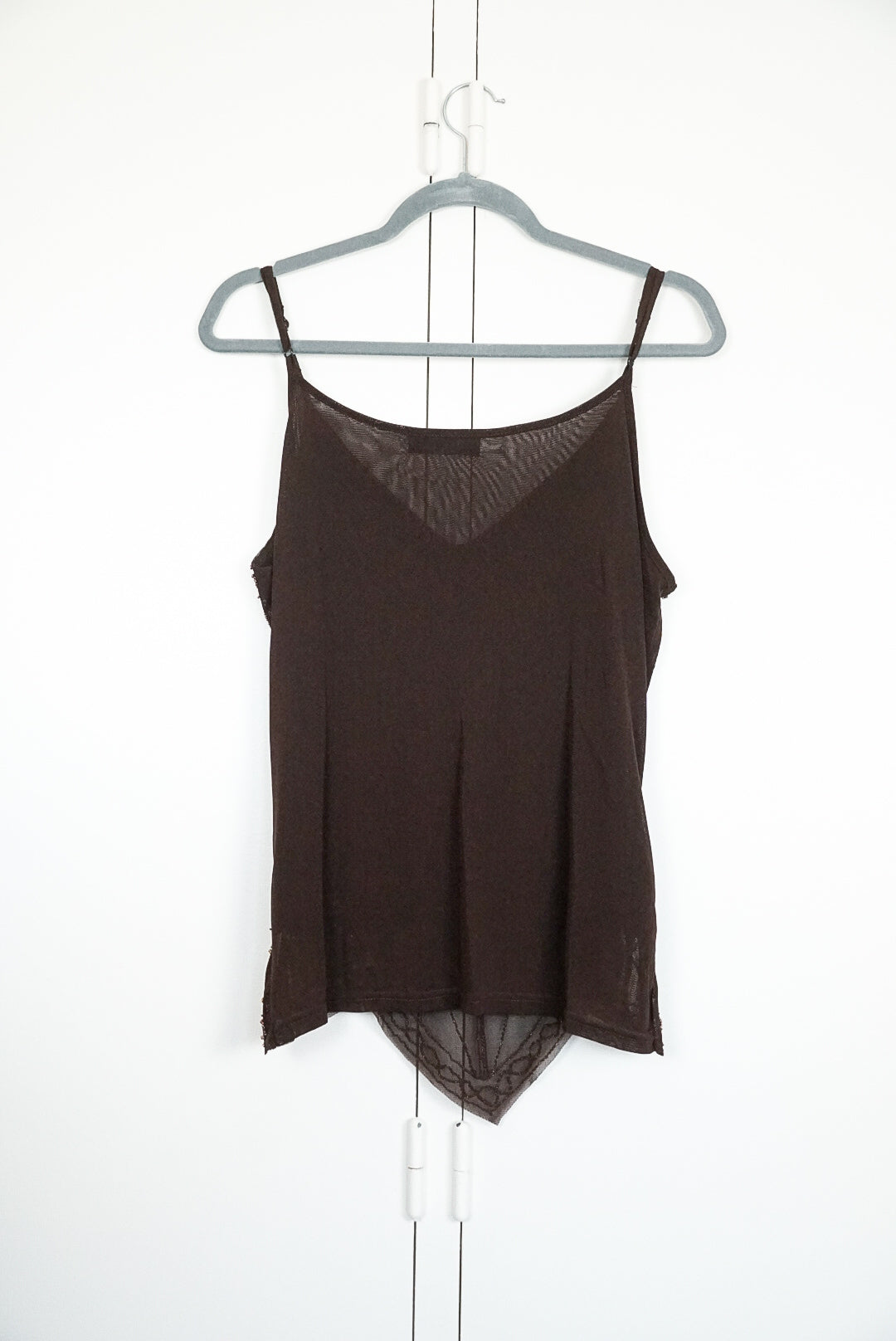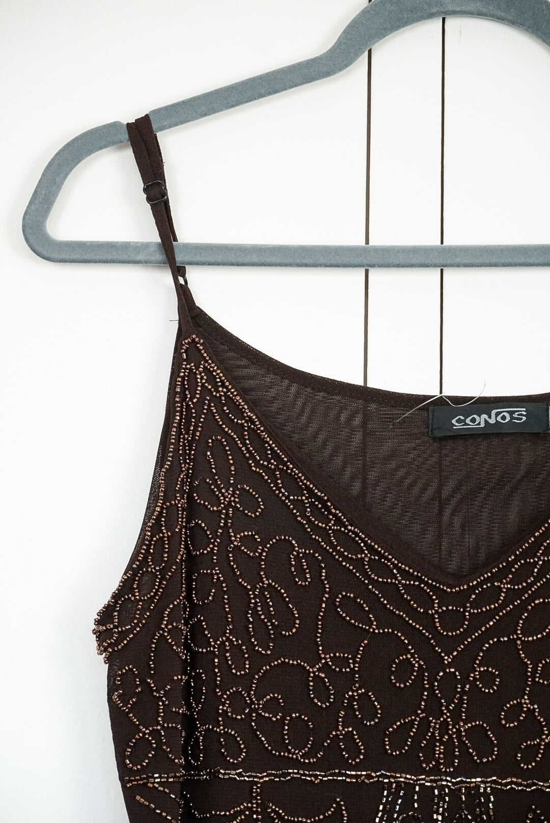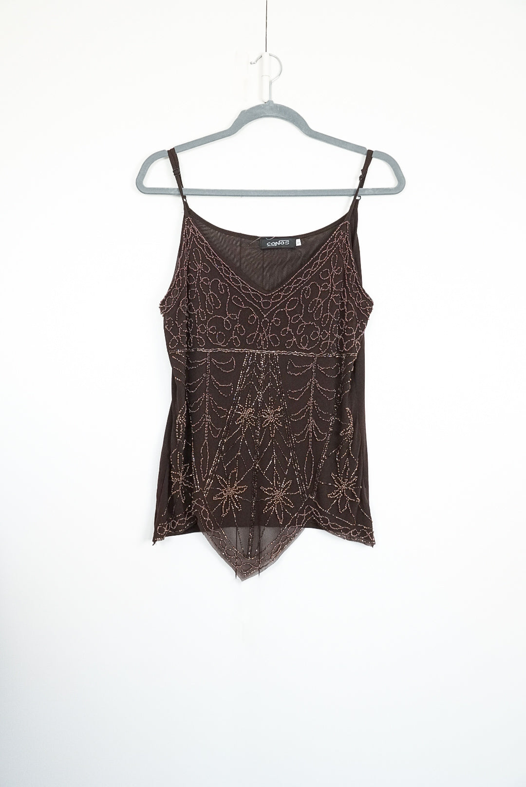 top marron brodée de perles à bretelle réglable, magnifique détail de coupe en forme de pointe en bas du top, broderie sur mesh en laine et coton, dos unis, doublé, de la marque Conos, fabriqué en Chine