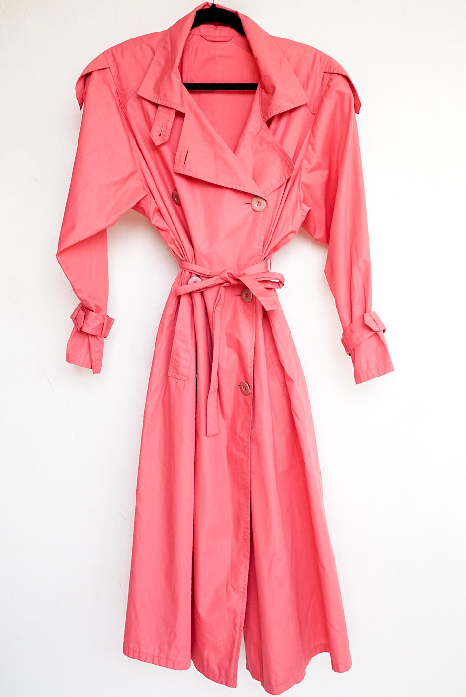 Trench long rose, ceinture à la taille, petite ceinture aux poignets, fente milieu bas dos, empiècement au niveau des épaules, parfait état, des années 90