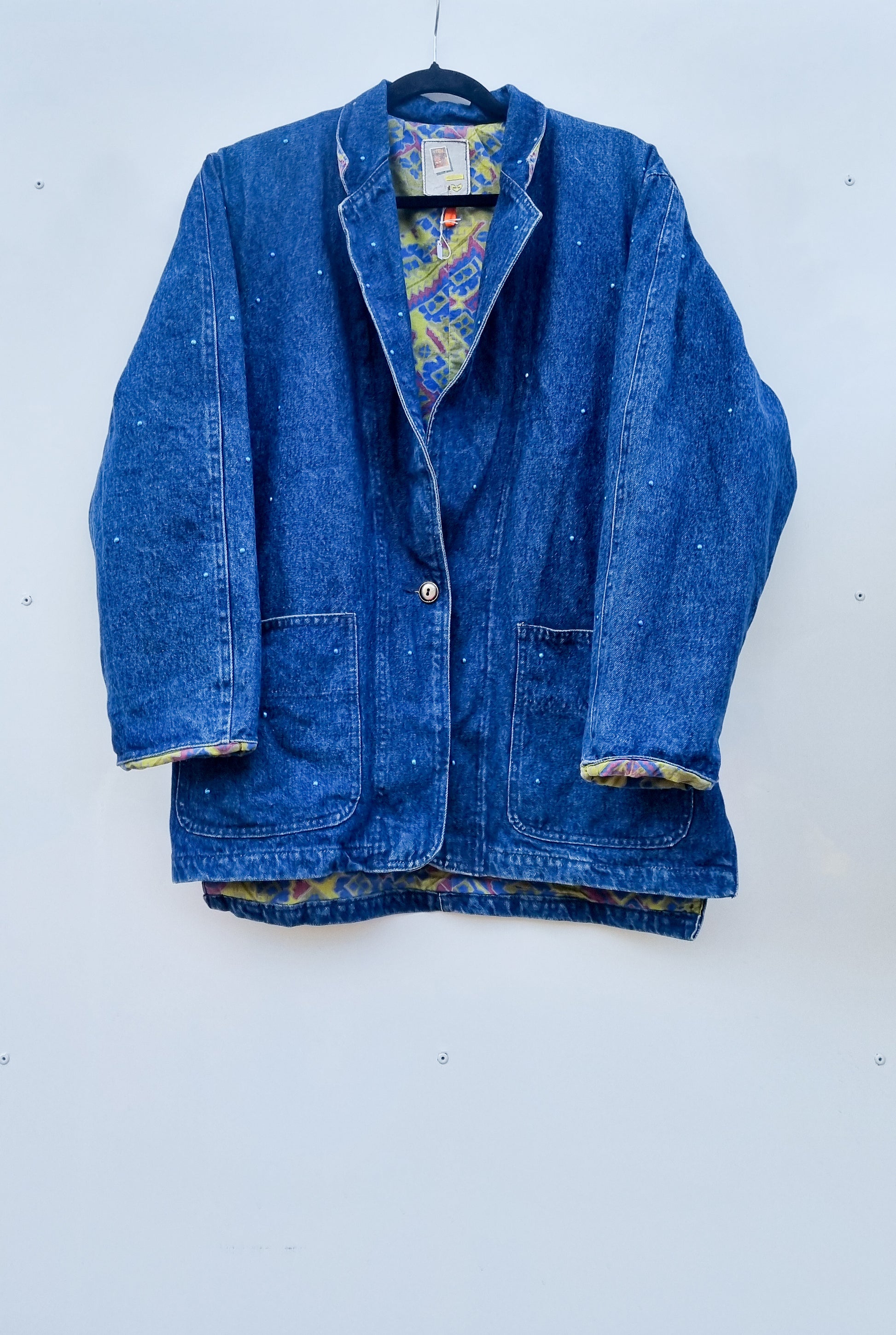 Veste en denim bleu marine avec des détails de strass mat bleu, doublure en coton imprimé, deux poches plaquées, un bouton, ouverture fentue sur le côté bas, col tailleur, oversize