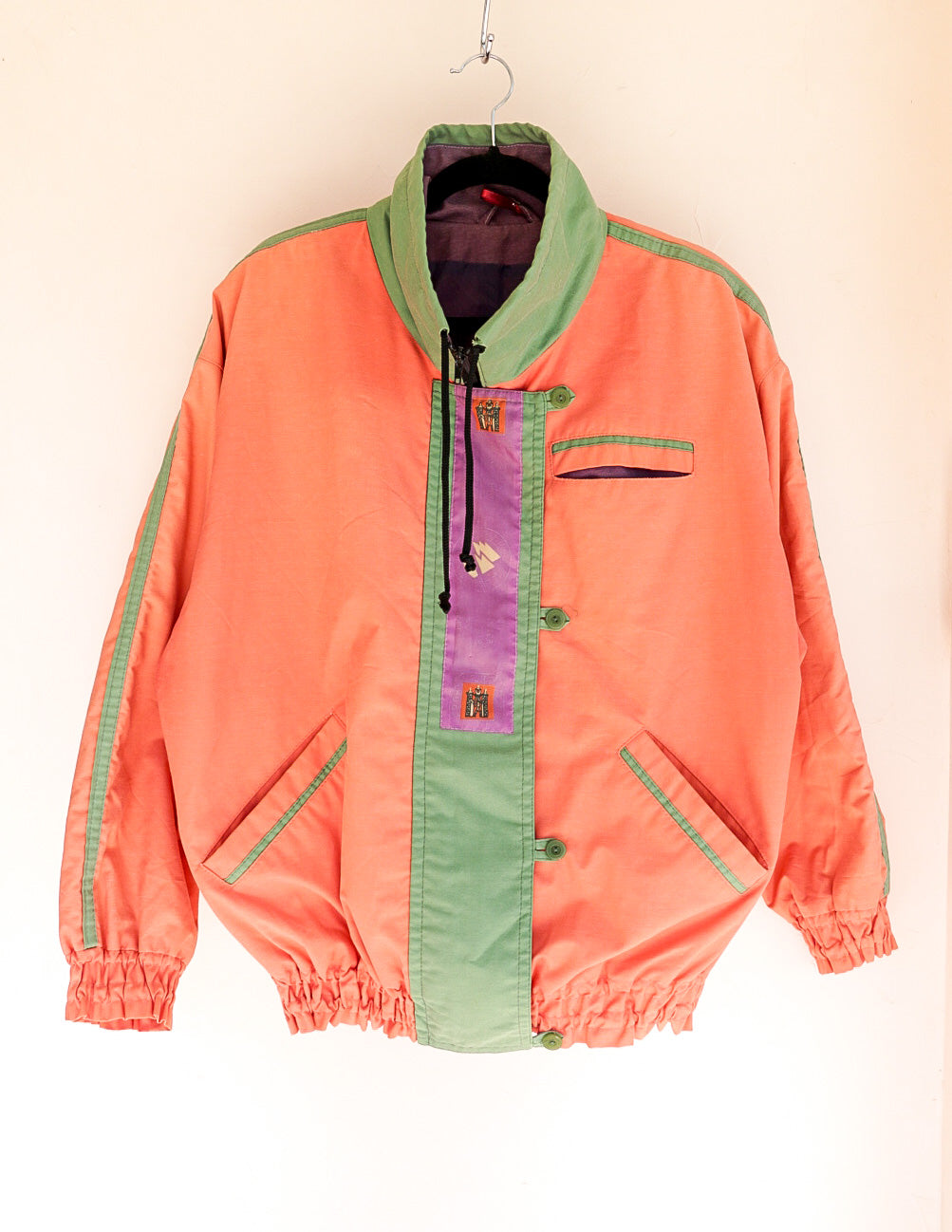 Veste color block saumon, verte et violette des années 80, col montant avec lien, fermeture éclair, rabat protège fermeture éclair avec boutonnière, bas des manches et de la veste élastiqué en bon état , deux poches latérales et une poche poitrine, de la marque Sopotex